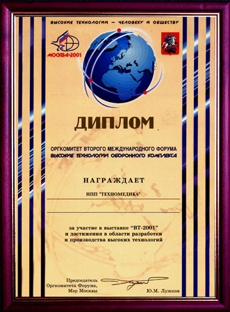 Second International Forum "HiTech of Military-industrial Establishment" certificate. Moscow, 2001.